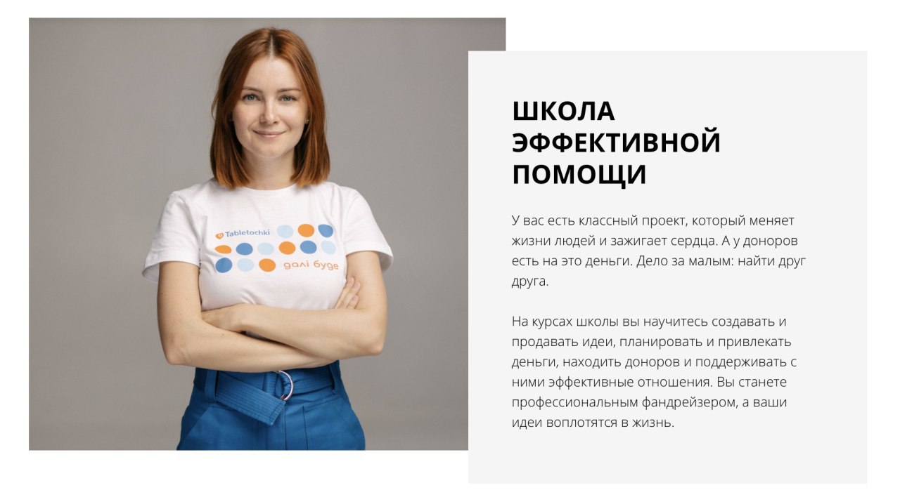 • Company: School of effective help by Olya Kudinenko, founder of Tabletochki charity fund
